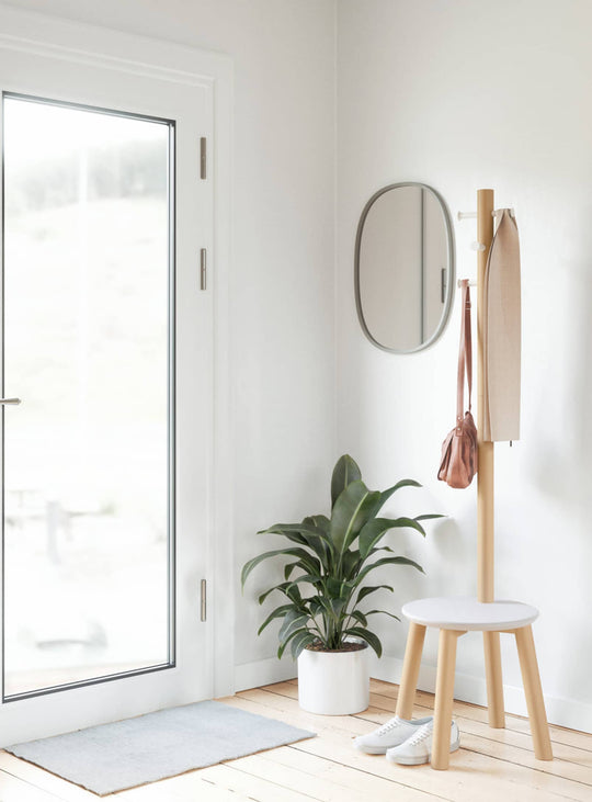 Porte-manteau avec tabouret Pillar d'Umbra, une solution 2-en-1 pour suspendre manteaux et s’asseoir confortablement.